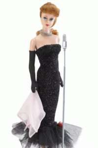 A glamorous Barbie in a strapless black gown, black opera gloves, and a vintage microphone—channeling classic Hollywood elegance.